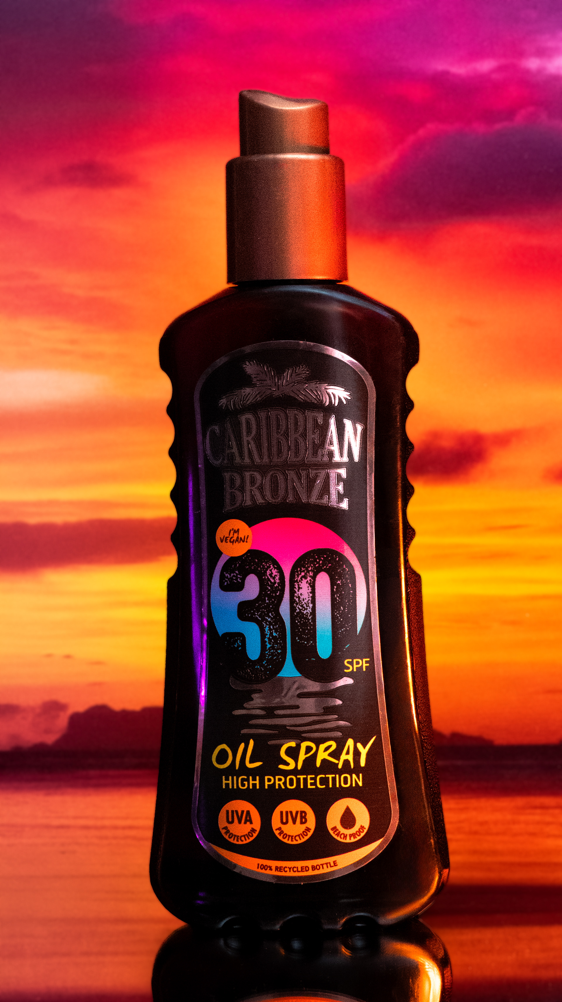 La lumière dorée vient sculpter le flacon et révéler ses textures, tandis que les couleurs du ciel renforcent l’idée de chaleur maîtrisée et de protection solaire.